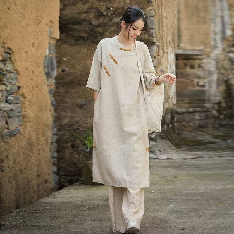 中国风连衣裙纯亚麻棉麻上衣复古盘扣刺绣花轻中式茶服女装连身裙