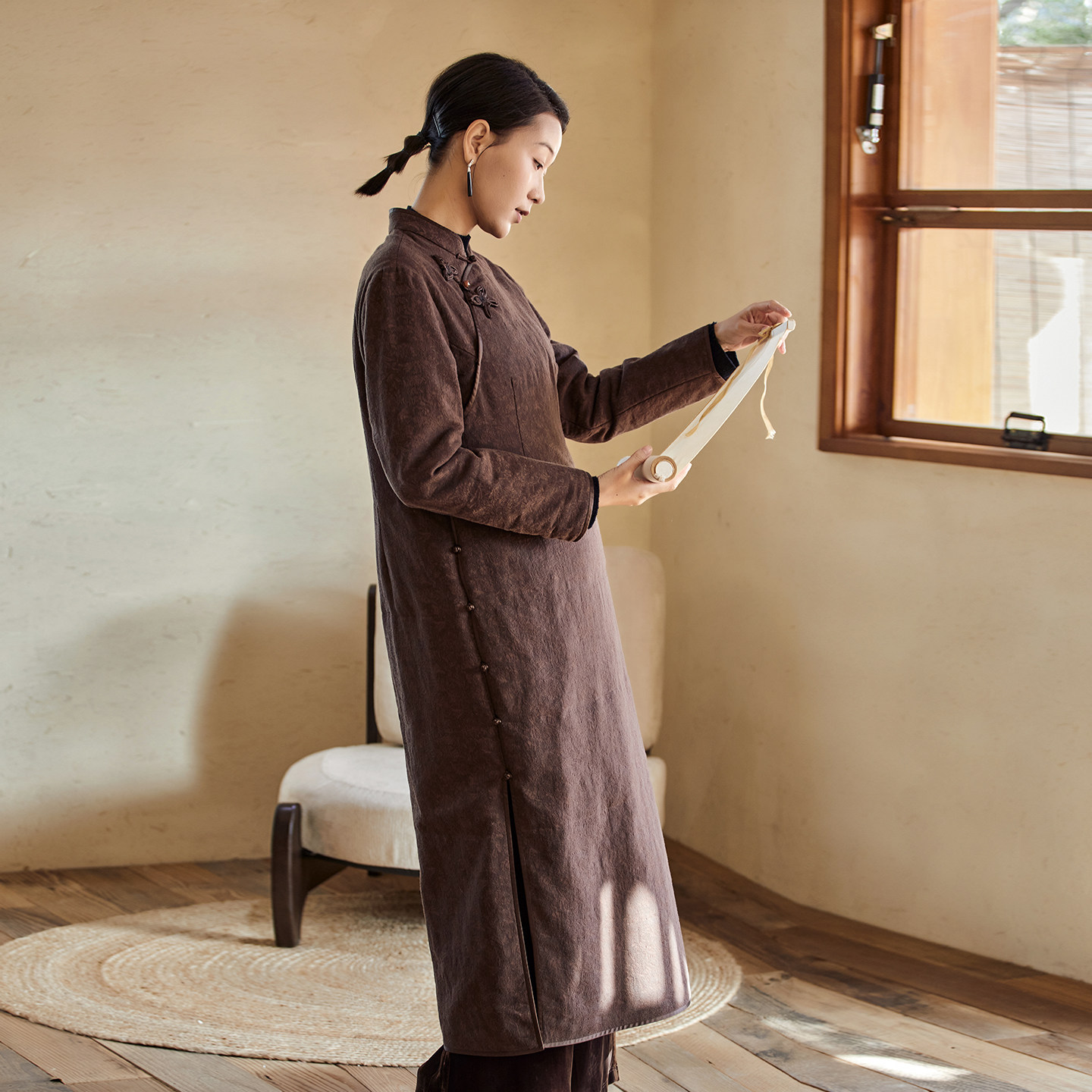 子曰原创复古偏襟盘扣砂洗亚麻棉袍文艺风宽松棉衣夹棉保暖连衣裙