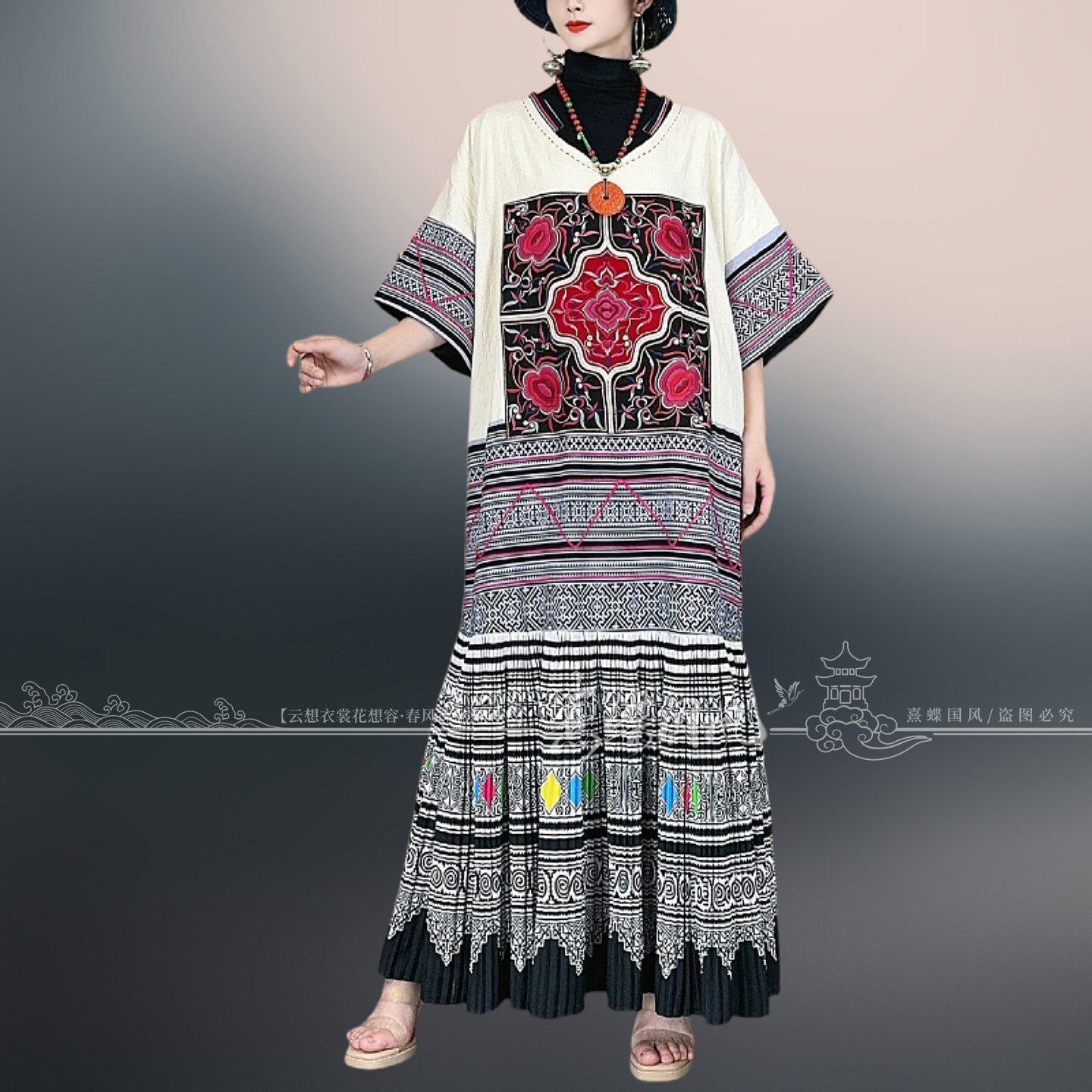 棉麻原创国风重工民族风刺绣气质V领复古风宽松袍子大摆连衣裙女