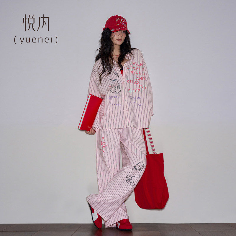 悦内睡衣女春秋季春款纯棉长袖家居服时尚可爱大码粉色条纹高级感