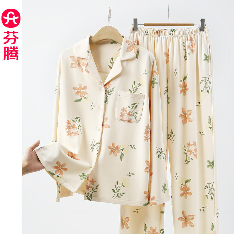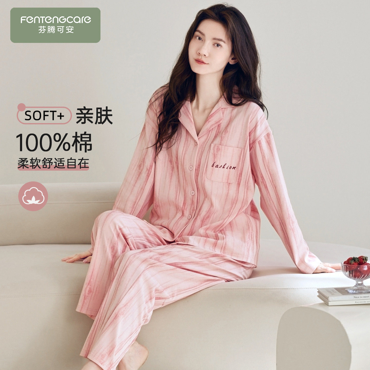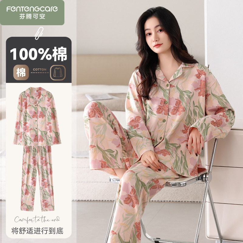 芬腾睡衣女士秋季春秋款纯棉长袖开衫春款新款全棉女款家居服套装