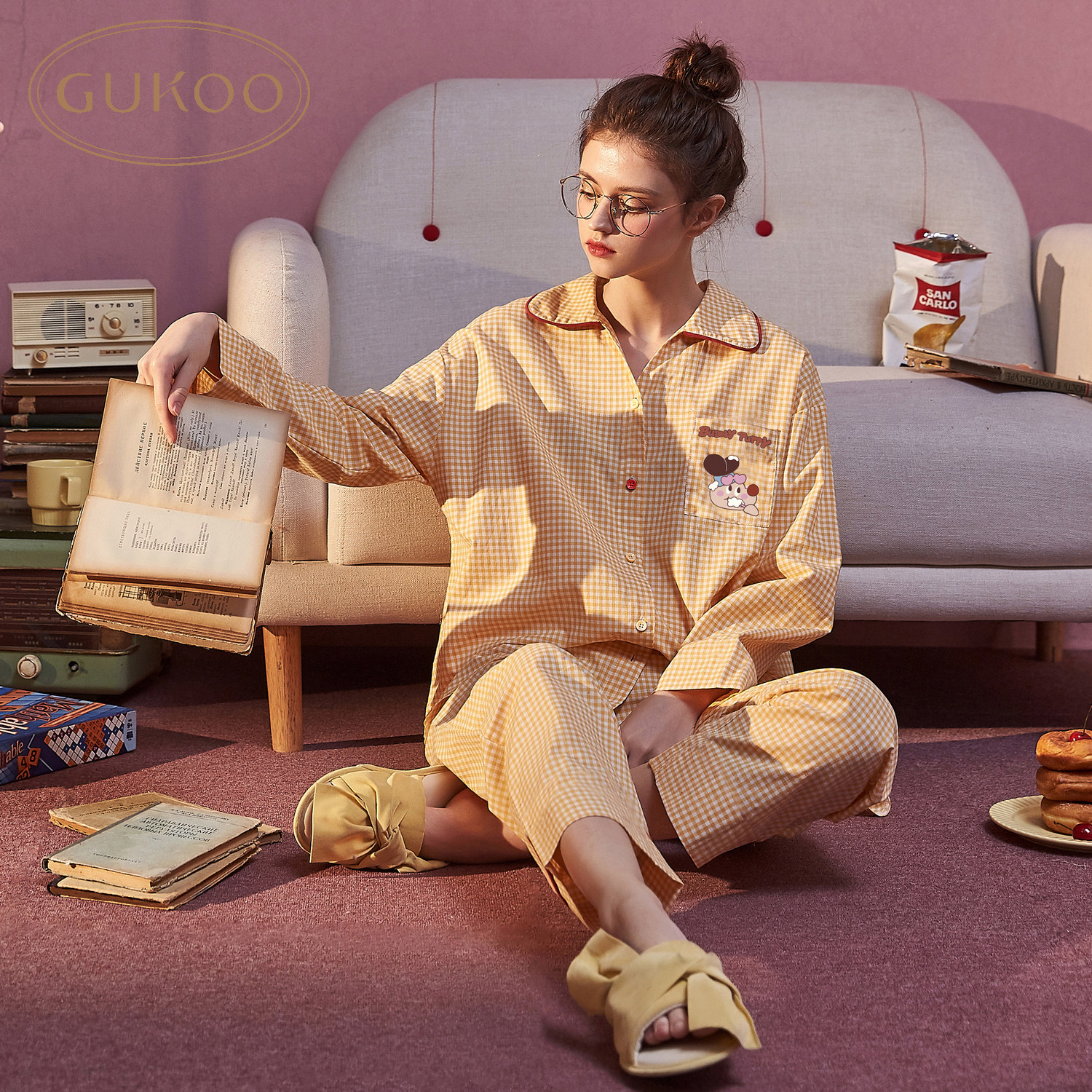 Gukoo/果壳睡衣女春款轰轰小狗系列纯棉格纹可外穿家居服套装