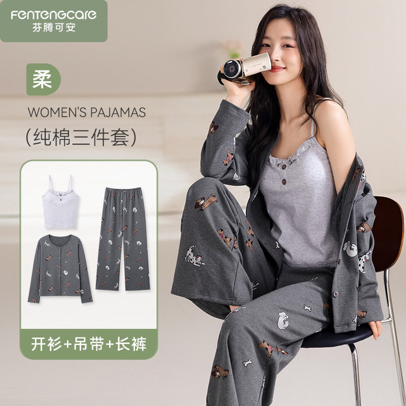 芬腾可安春款纯棉睡衣女三件套春秋季长袖性感吊带2026新款家居服