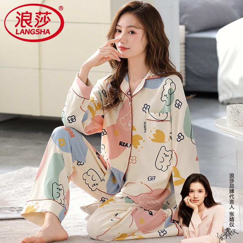 浪莎纯棉睡衣女士春款秋季开衫长袖100%全棉网红小熊家居服套装
