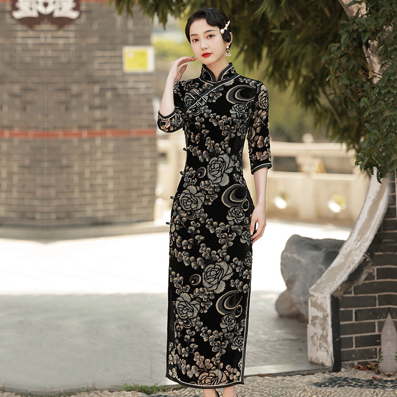 2025春装丝绒钉珠复古民族风高贵气质改良旗袍连衣裙优雅女装