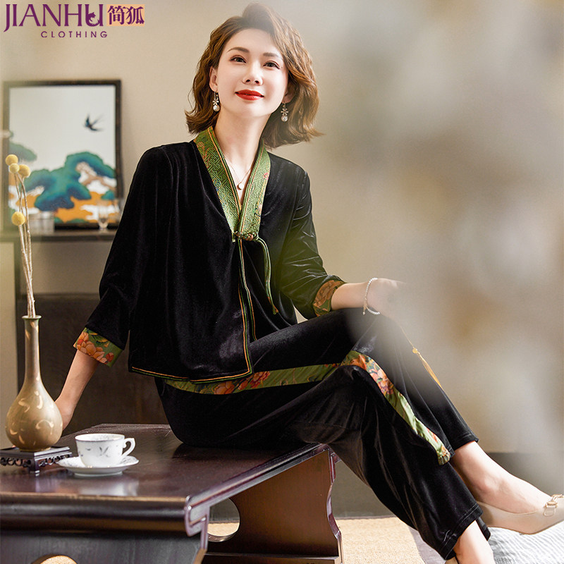 妈妈春装两件套洋气民族风上衣50岁中老年女装春秋金丝绒运动套装
