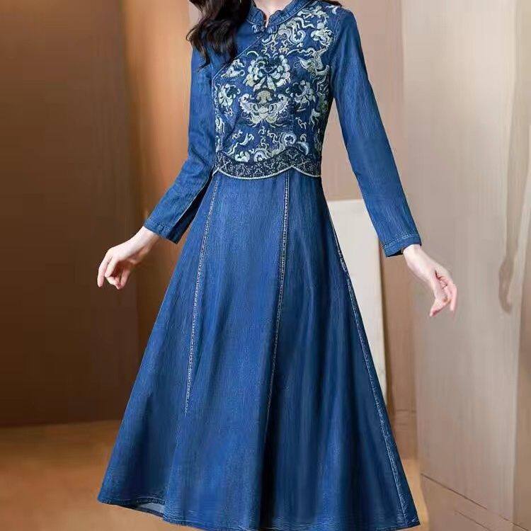 牛仔连衣裙女短袖2023春装新款民族风改良版旗袍重工刺绣牛仔长裙