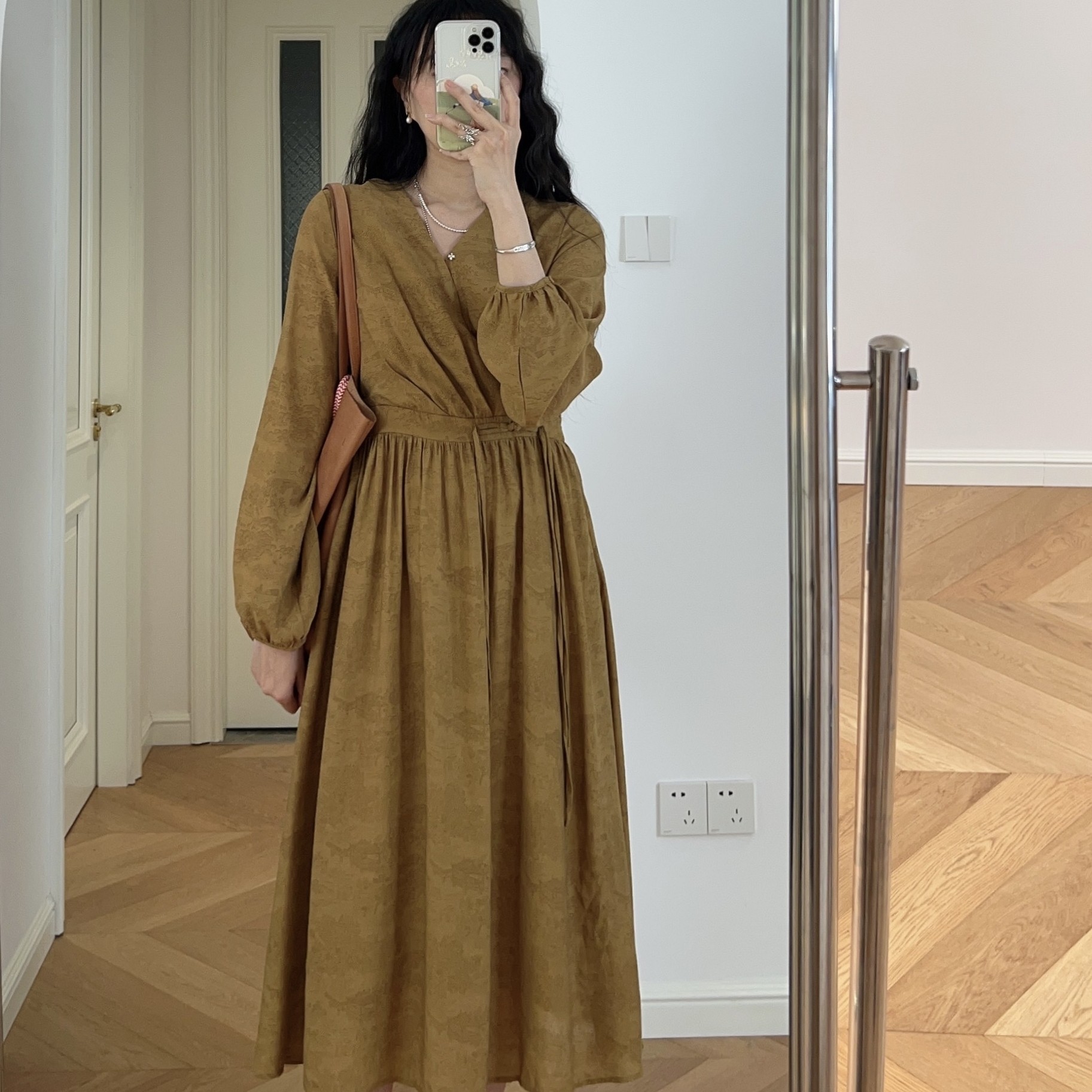 2020年新款春装连衣裙民族风复古女装七分袖V领气质大摆型连衣裙