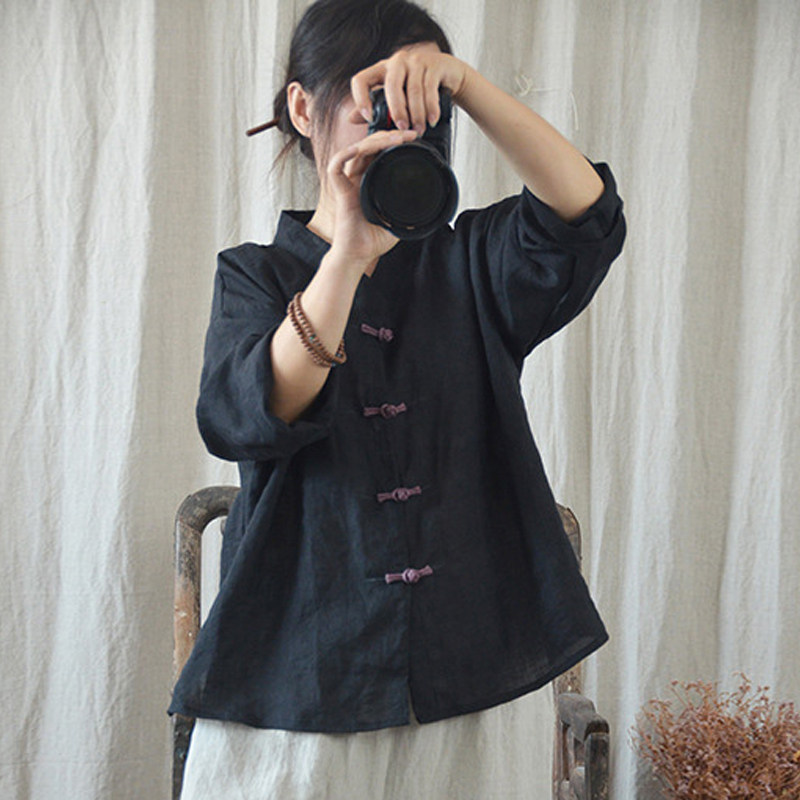 春装复古文艺风格上衣中式民族风纯苎麻手工盘扣长袖棉麻女装衬衫
