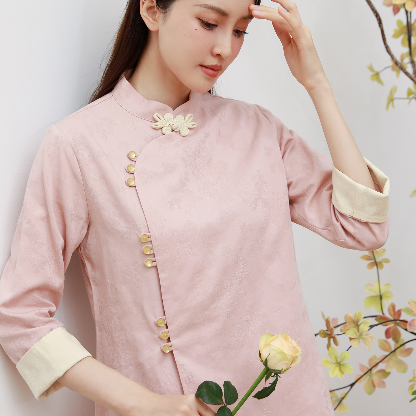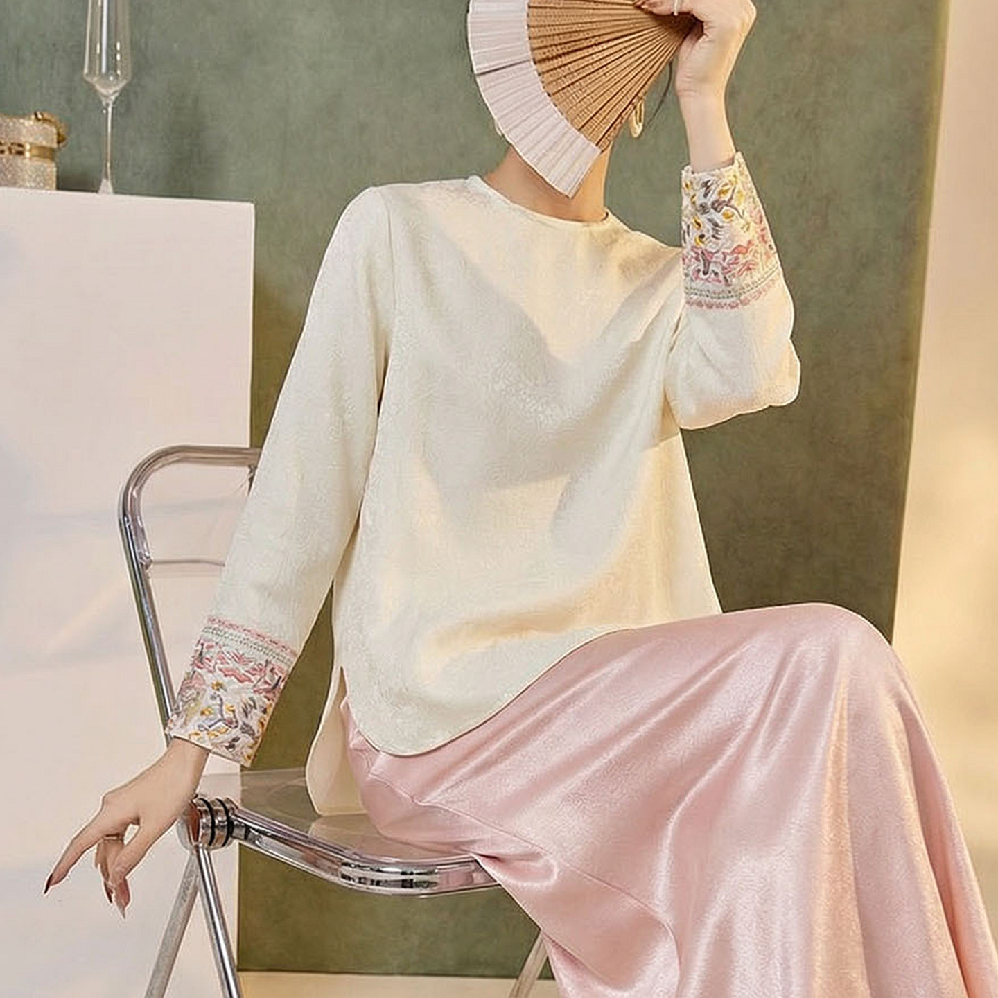 AYOMIS新中式民族风刺绣袖口上衣2026春装新品精致提花打底衬衫女