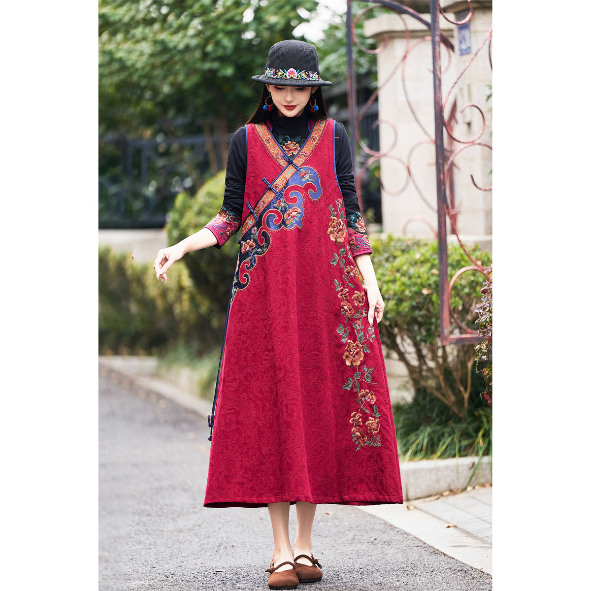 春装新款中国风V领刺绣花无袖连衣裙女民族盘扣提花A字长连衣裙女