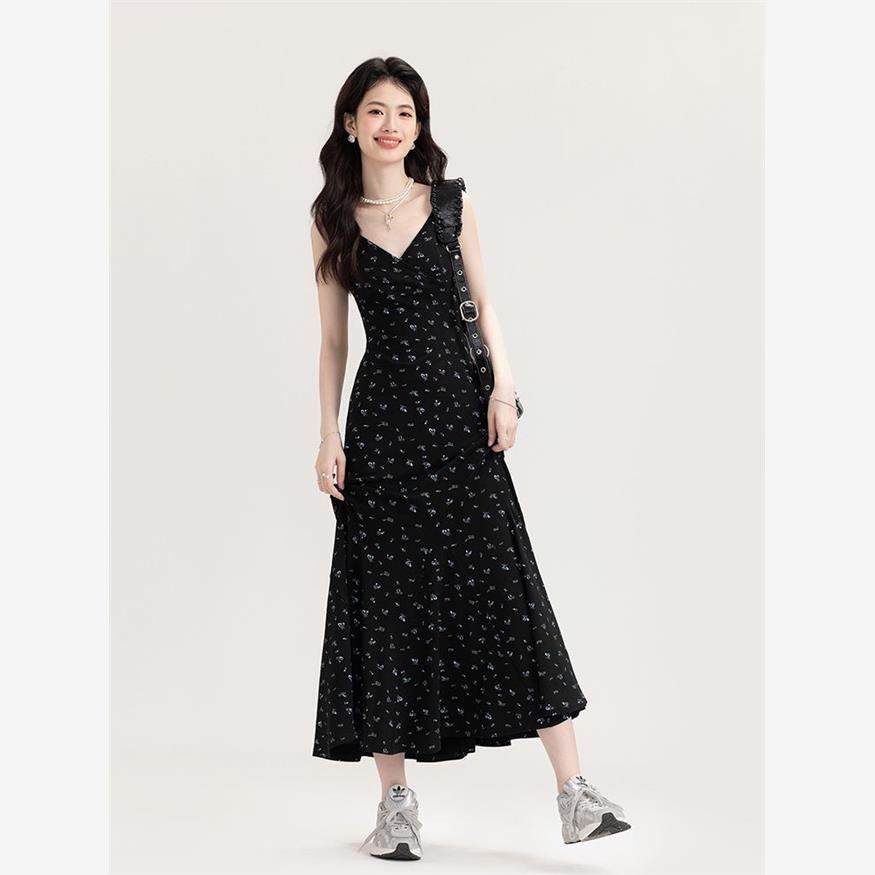 【碎花点点】小众设计黑底碎花吊带长裙女2024新款修身a字连衣裙