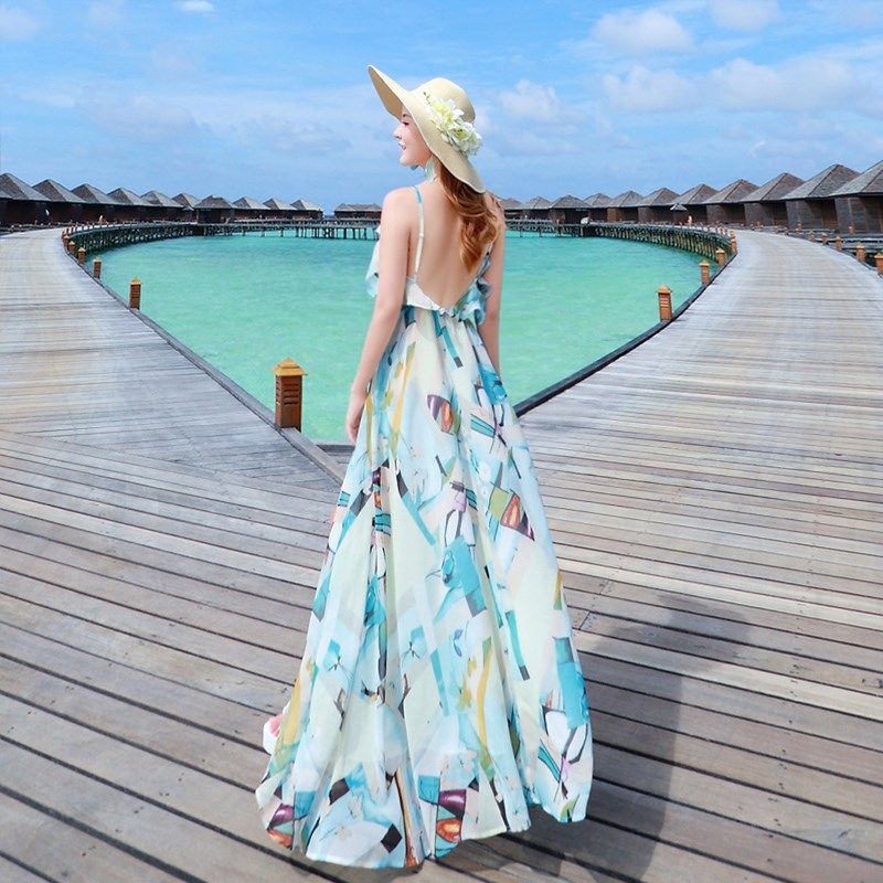 新款夏季泰国海南三亚度假连衣裙海边大码沙滩裙女装碎花吊带长裙