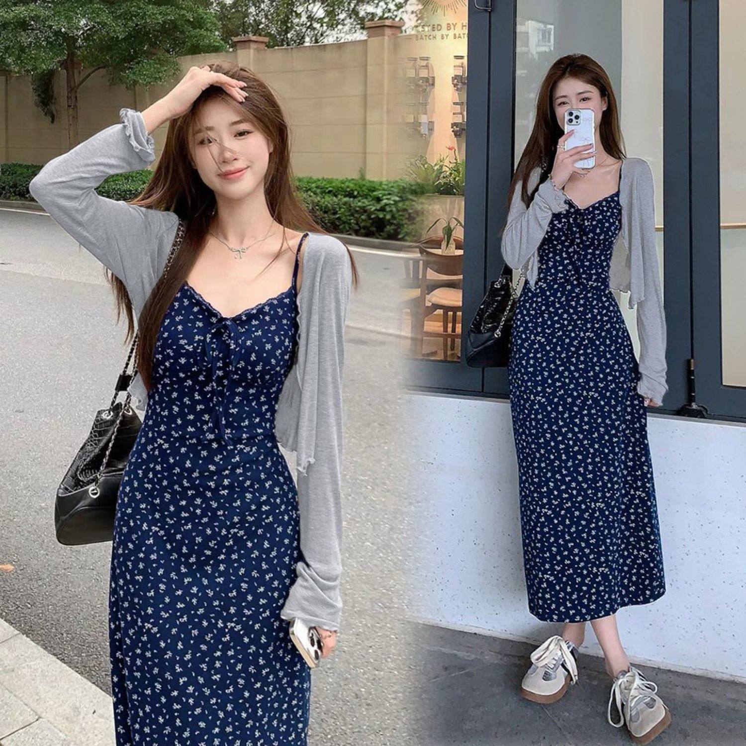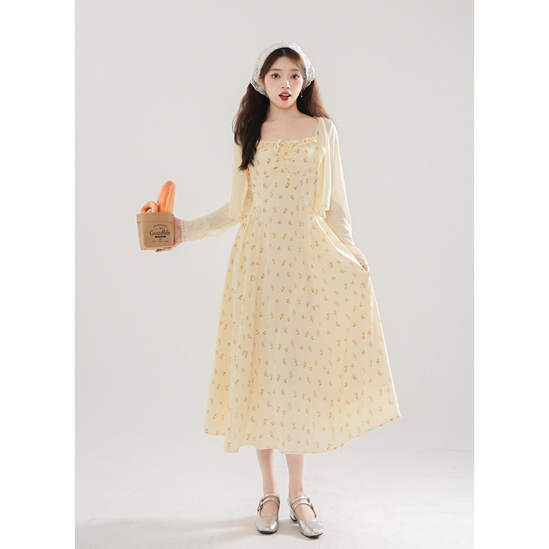 雪梨气泡水/甜美气质挂甜美千金修身碎花吊带长裙+温柔开衫两件套