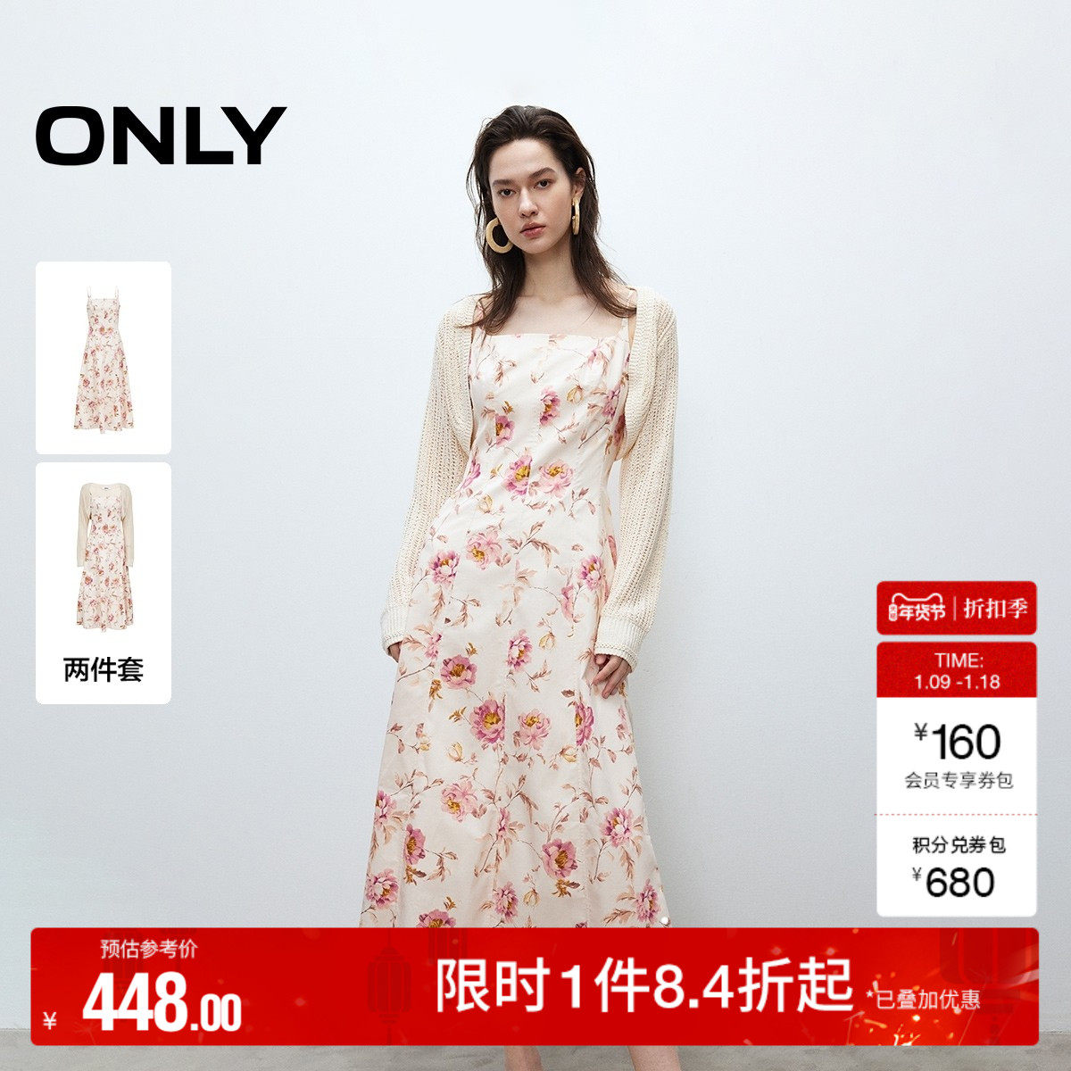 ONLY2025秋冬新款清新甜美镂空针织罩衫碎花吊带长裙套装连衣裙女