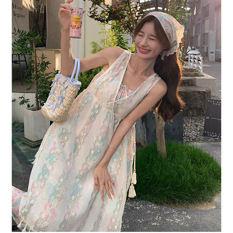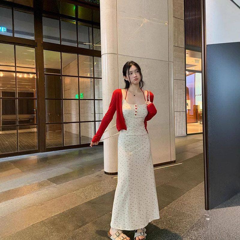 曼塔水仙韩系辣妹绑带碎花吊带长裙慵懒度假风裙子搭红色开衫套装