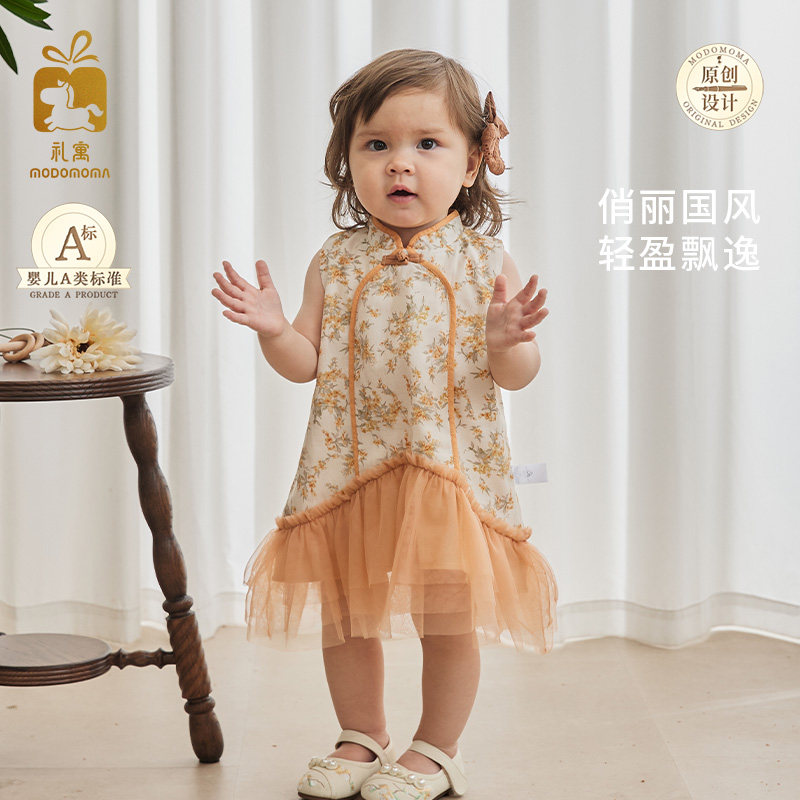 modomoma【芳辰】女童连衣裙夏季国风中式公主裙子碎花无袖网纱裙