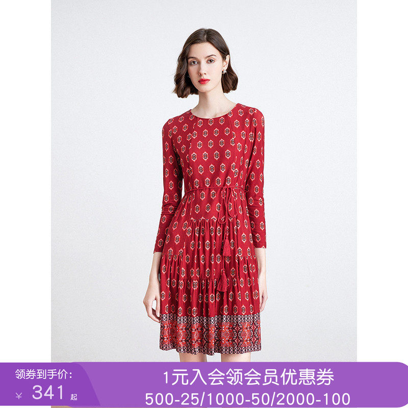 沐兰波西米亚印花连衣裙2025年春秋新款简约圆领修身大摆中长裙