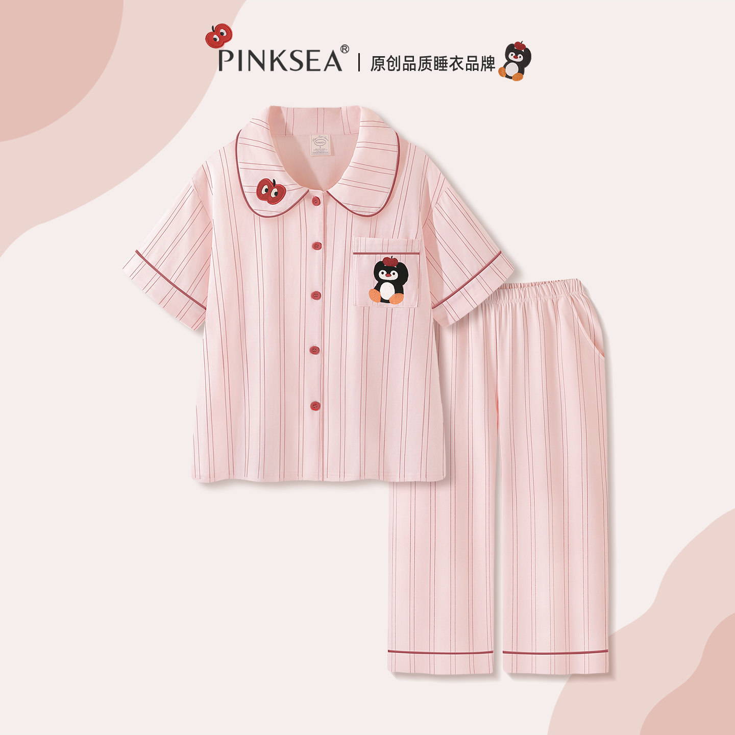 Pinksea睡衣女款2026新款夏粉色凉感纯棉短袖长裤春秋家居服套装
