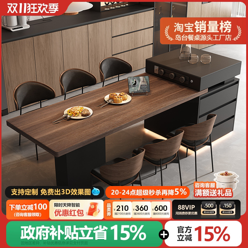 意式极简胡桃木纹岩板可伸缩岛台餐桌一体家用微波炉多功能中导台