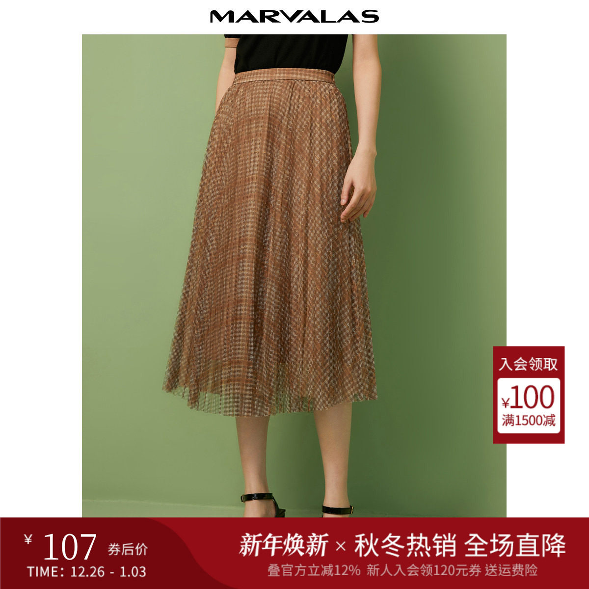 曼德诗纱裙女2025冬季新款格纹百褶半身裙雪纺中长款裙子a字裙