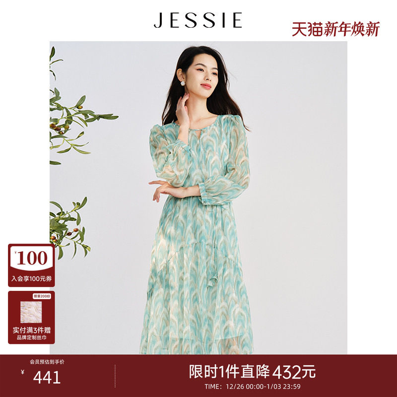 JESSIE印花V领连衣裙女春装新款中长款雪纺裙女度假风系带收腰款