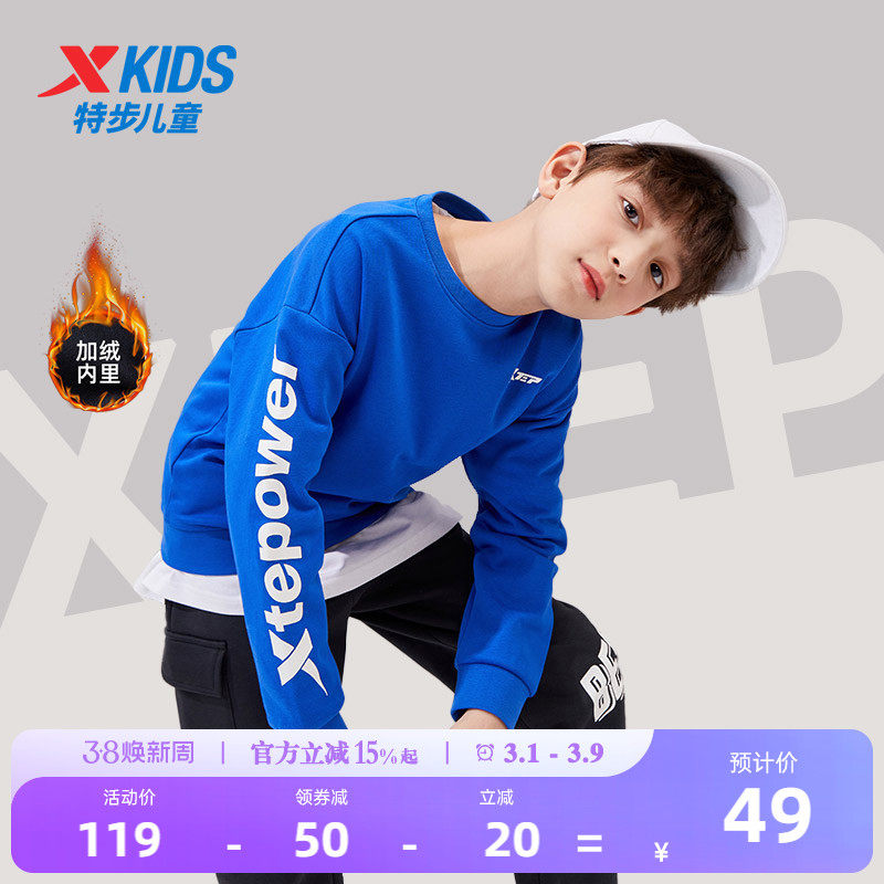 特步童装男童圆领加绒卫衣2026年春季新款儿童春装中大童运动上衣