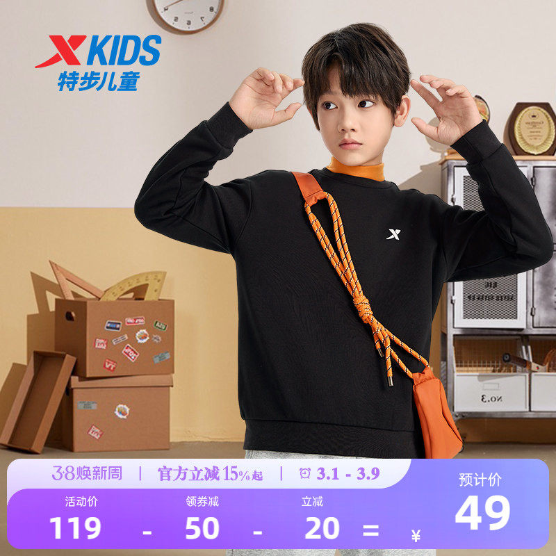特步童装男童圆领卫衣2026春季新款大童春装儿童套头加绒运动上衣