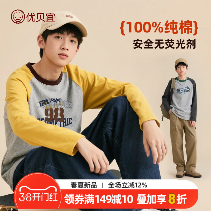 优贝宜男童长袖t恤纯棉2026新款春装中大童男孩上衣儿童打底衫