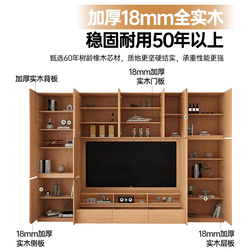 定制橡木满墙电视柜75寸白色全实木收纳储物一体客厅家用靠墙边柜