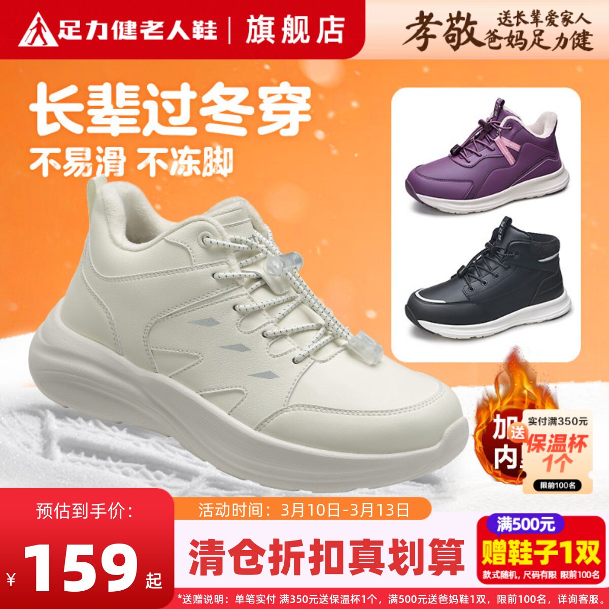 足力健老人鞋官方旗舰店正品加绒保暖棉鞋冬老年妈妈女奶奶健步鞋