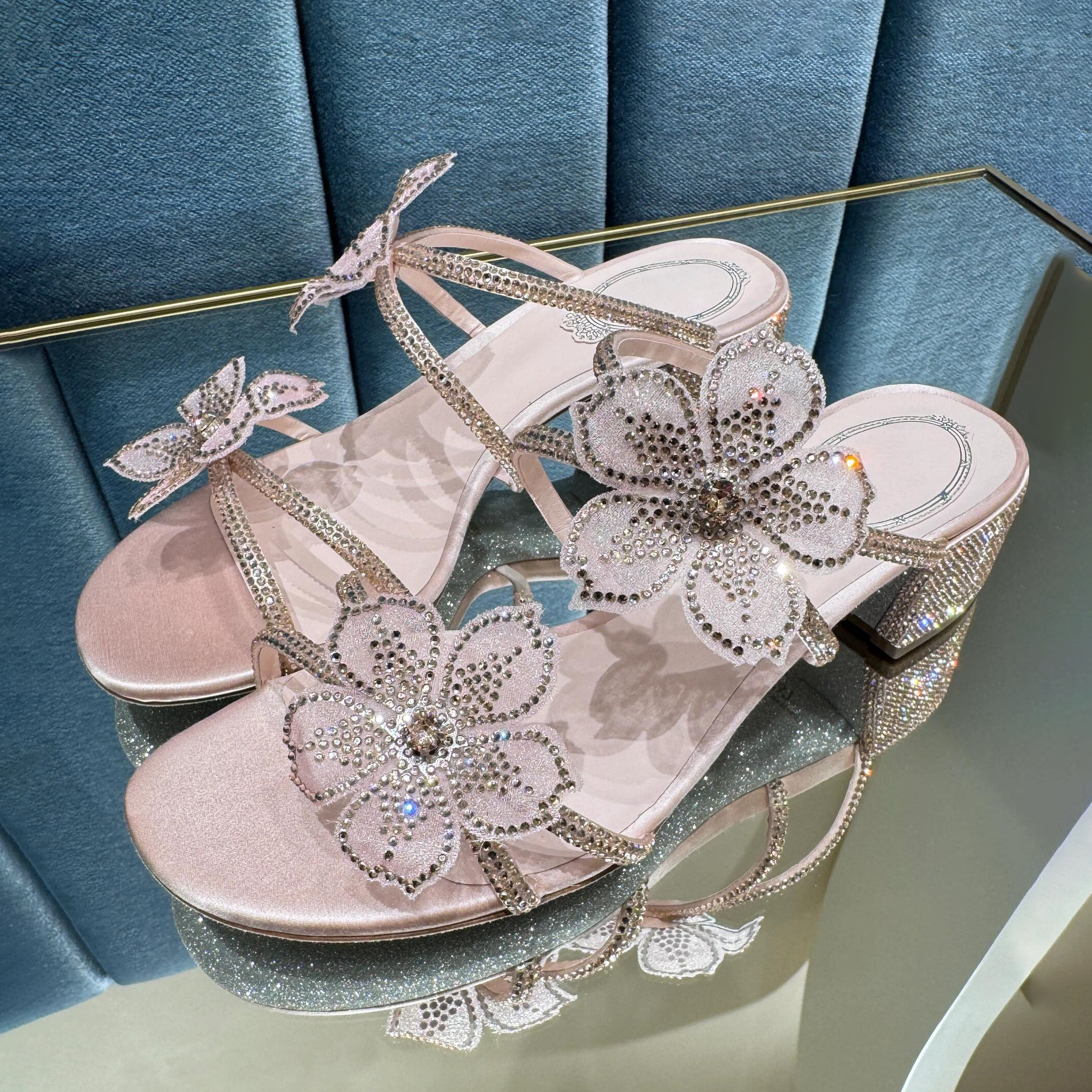 仙女水晶鞋法式绝美蕾丝花朵水钻拖鞋水钻粗跟凉鞋高级感公主凉拖