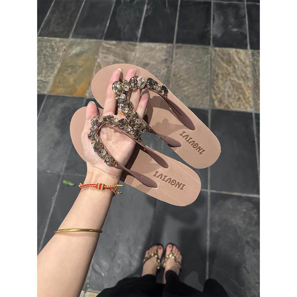 绝美凉拖鞋外穿女夏仙女小香风外出海边沙滩配裙子平底带水钻拖鞋