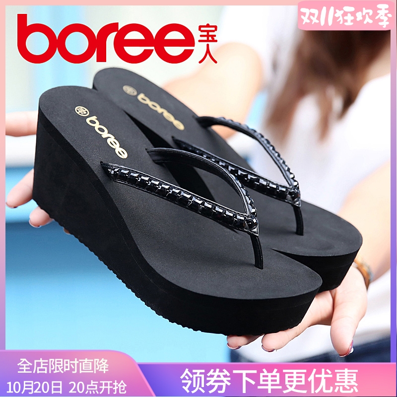 宝人外穿人字拖女2025夏季水钻拖鞋坡跟沙滩鞋松糕防滑厚底凉拖鞋