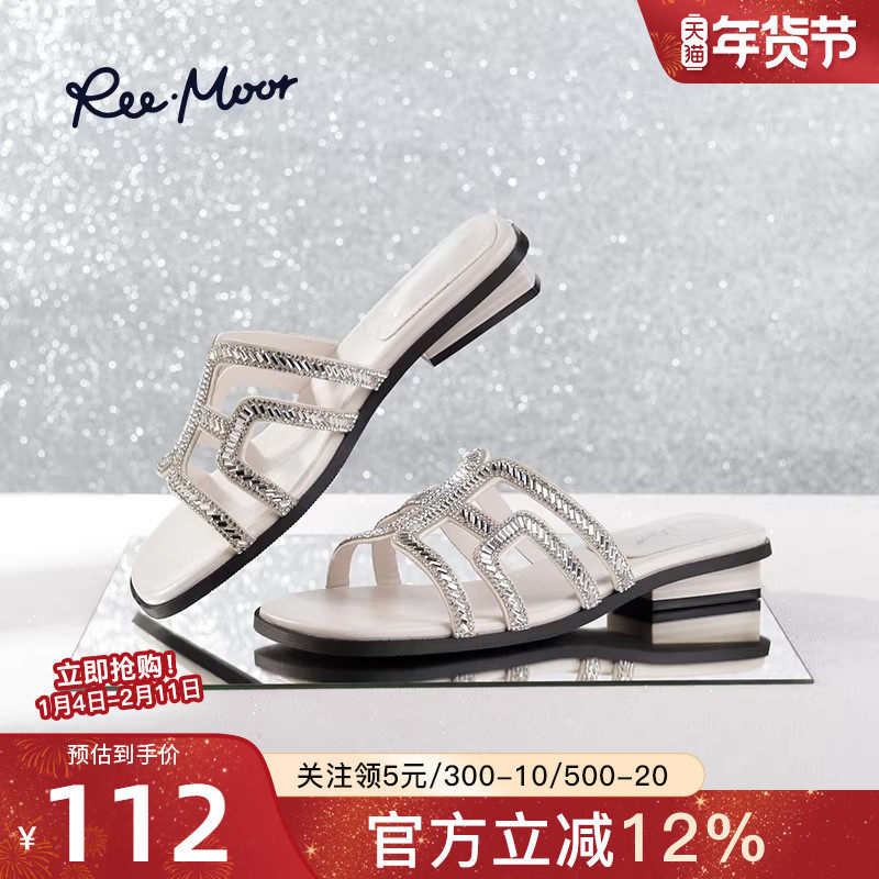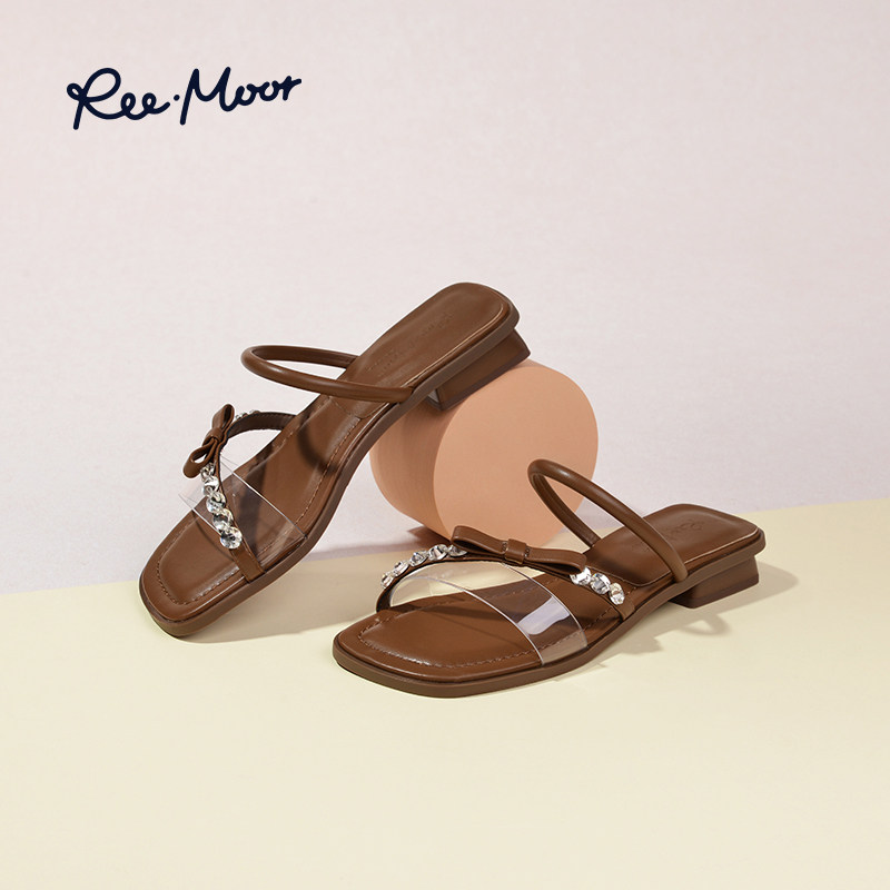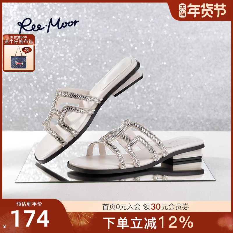 REEMOOR睿慕2025春夏新款法式水钻拖鞋女外穿平底一字凉拖高级感