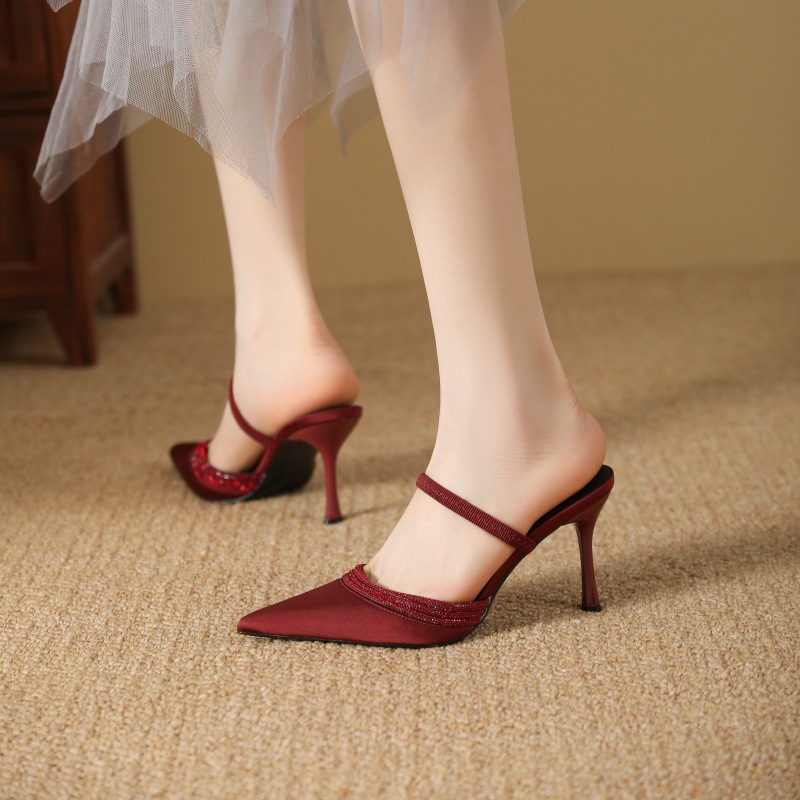 网红水钻拖鞋女夏时尚尖头细跟女鞋2025新款凉拖女高跟包头半拖