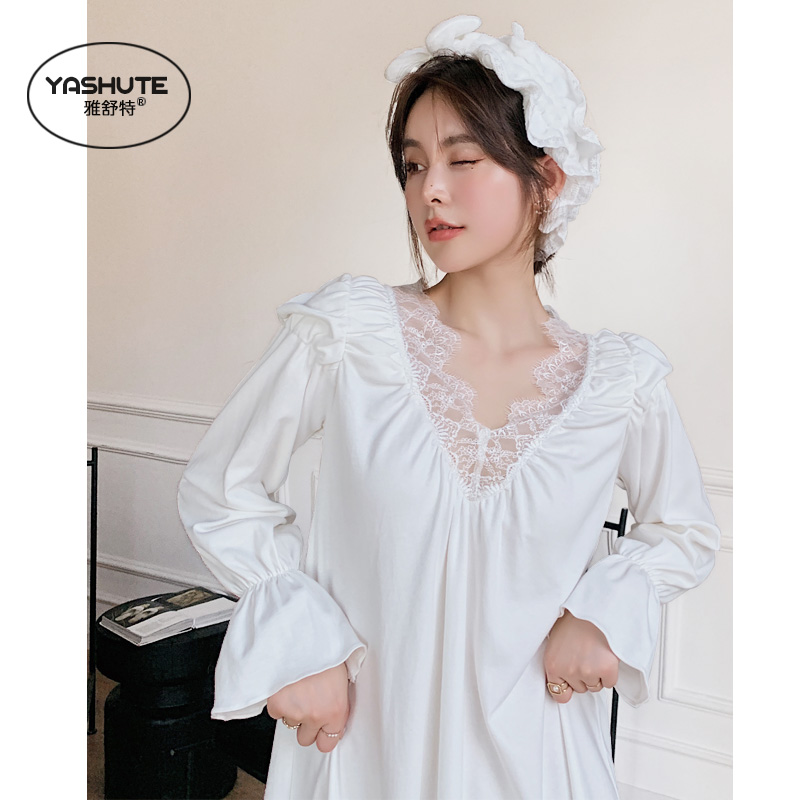 2020年新款公主风宫廷睡裙女春秋法式蕾丝连衣裙复古小众全棉睡裙