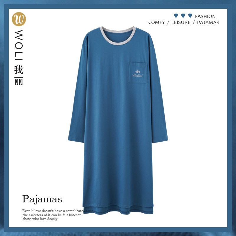 全棉睡裙男士睡衣春秋款纯棉年轻男土秋季过膝休闲棉绸长袖群薄款