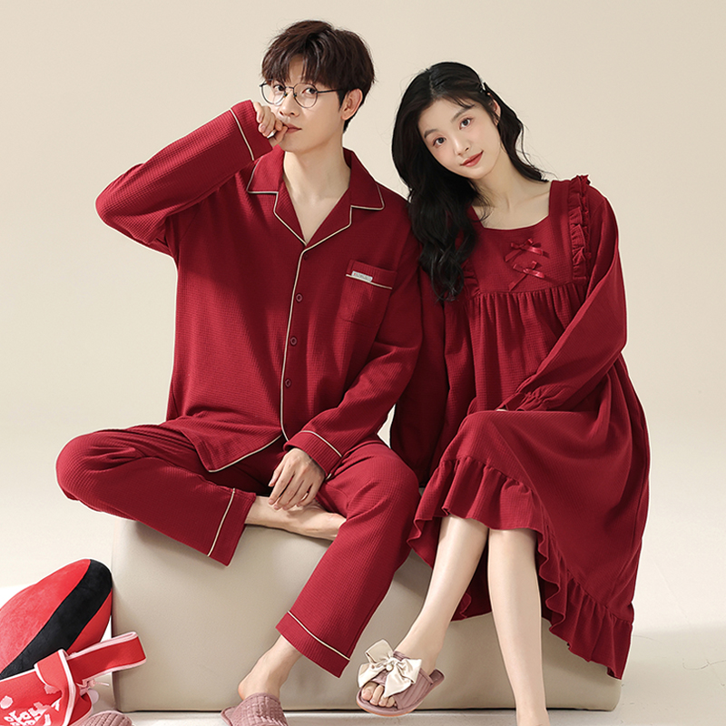 正品新婚结婚情侣睡衣春秋纯棉长袖喜庆酒红色全棉睡裙家居服套装