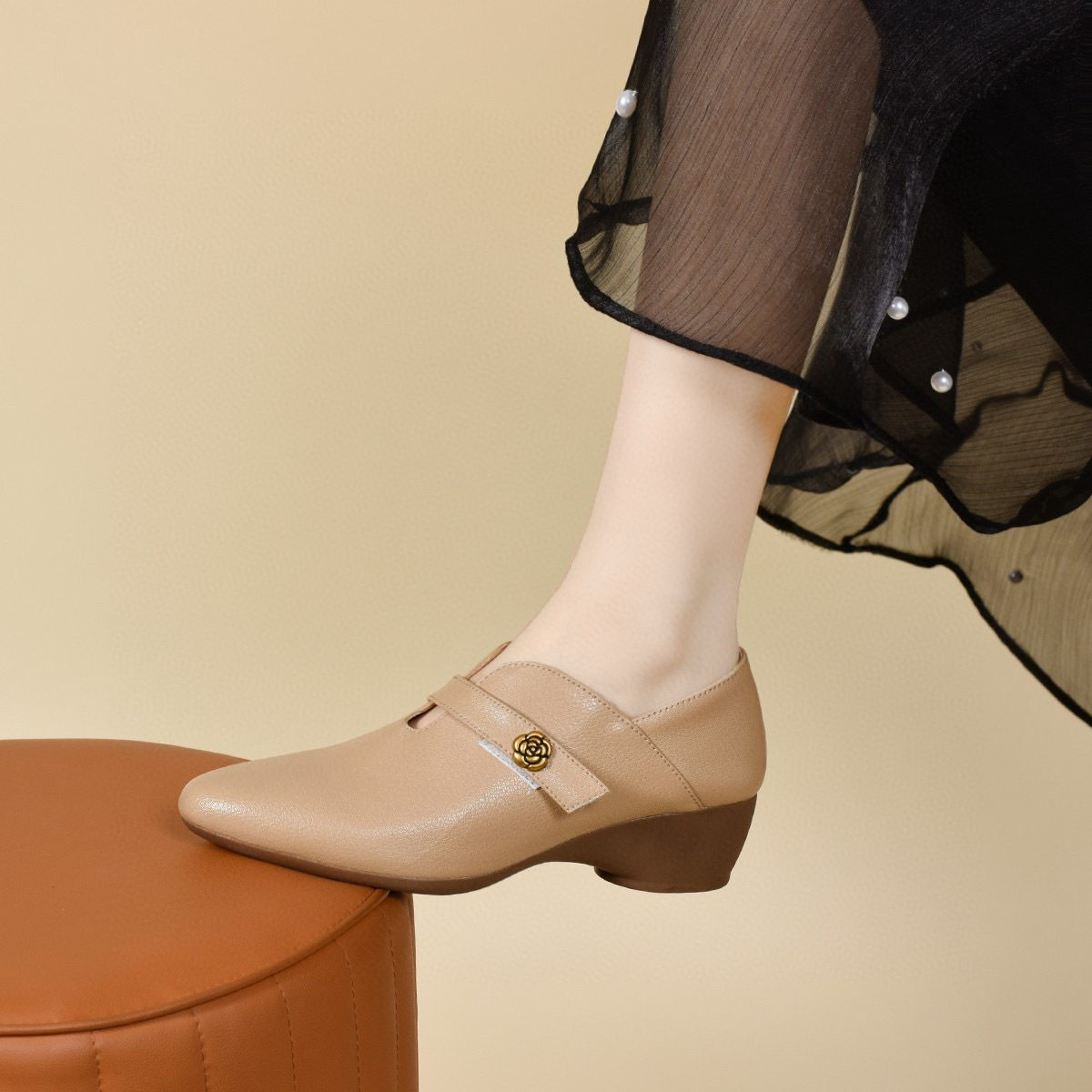 尖头深口单鞋女2025英伦风花朵小皮鞋粗跟中跟皮鞋套脚坡跟乐福鞋
