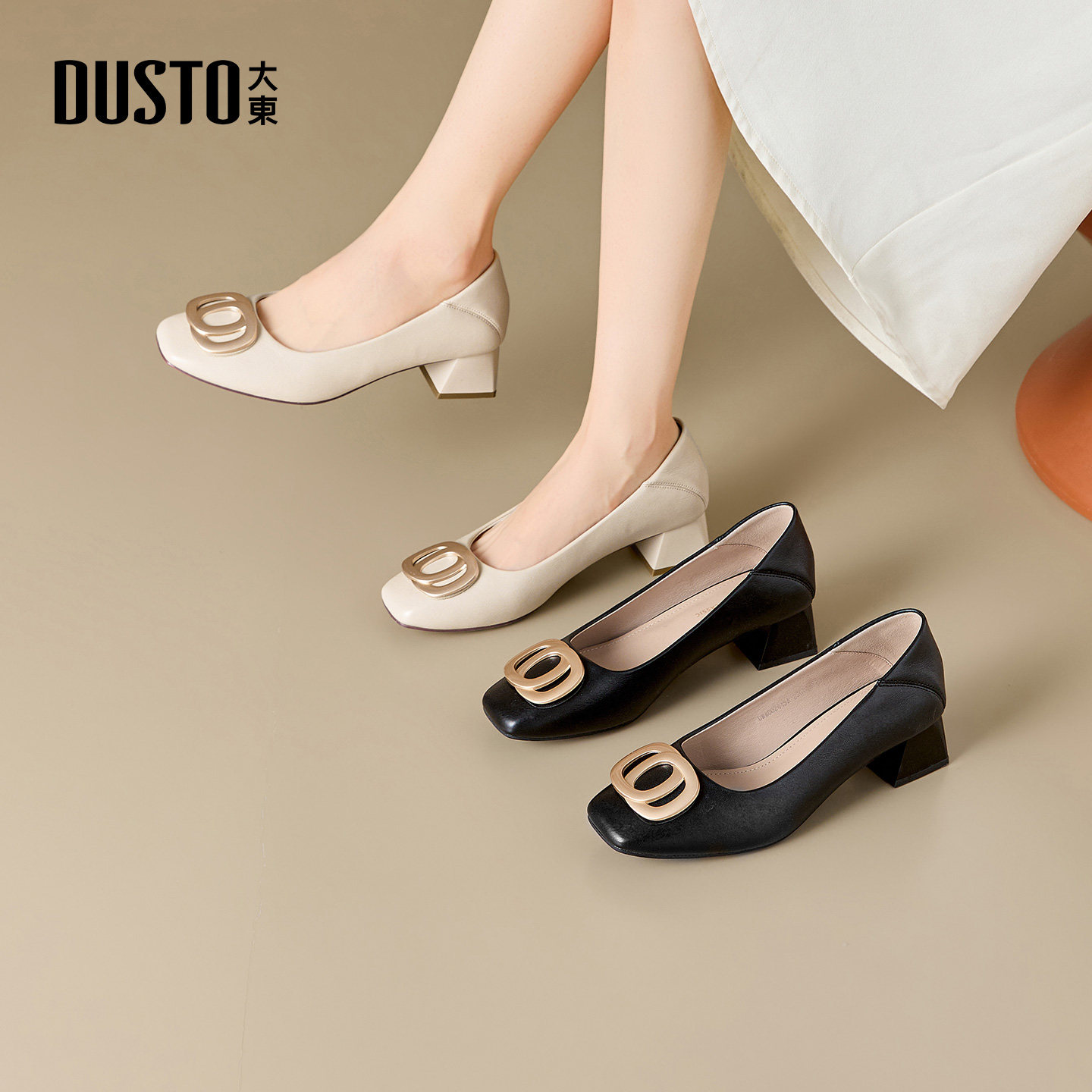 大东浅口单鞋2026年春季女鞋新款中跟粗跟套脚方头装饰002415A