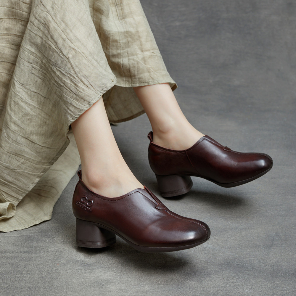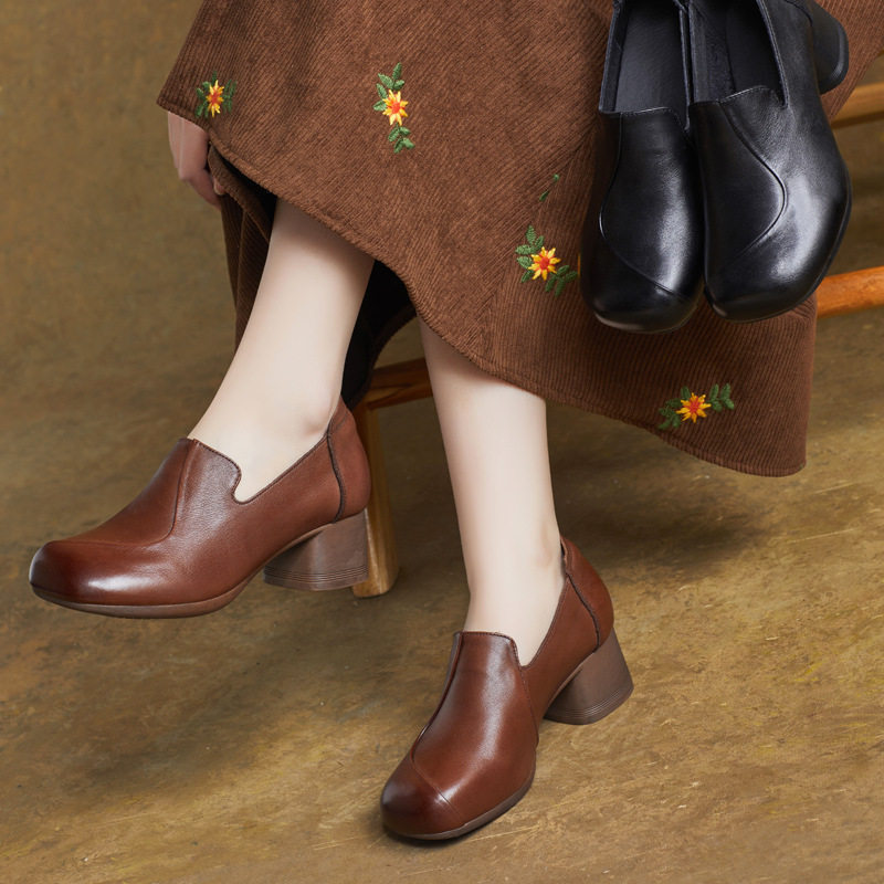 2025春季新款圆头手工真皮舒适粗跟中跟深口单鞋套脚英伦女鞋