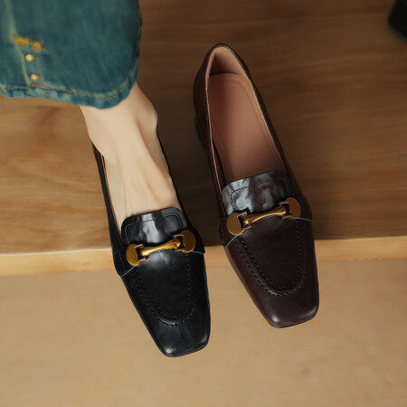 小池在首尔2023秋季方头中口粗跟套脚女单鞋ins风中跟乐福鞋皮鞋