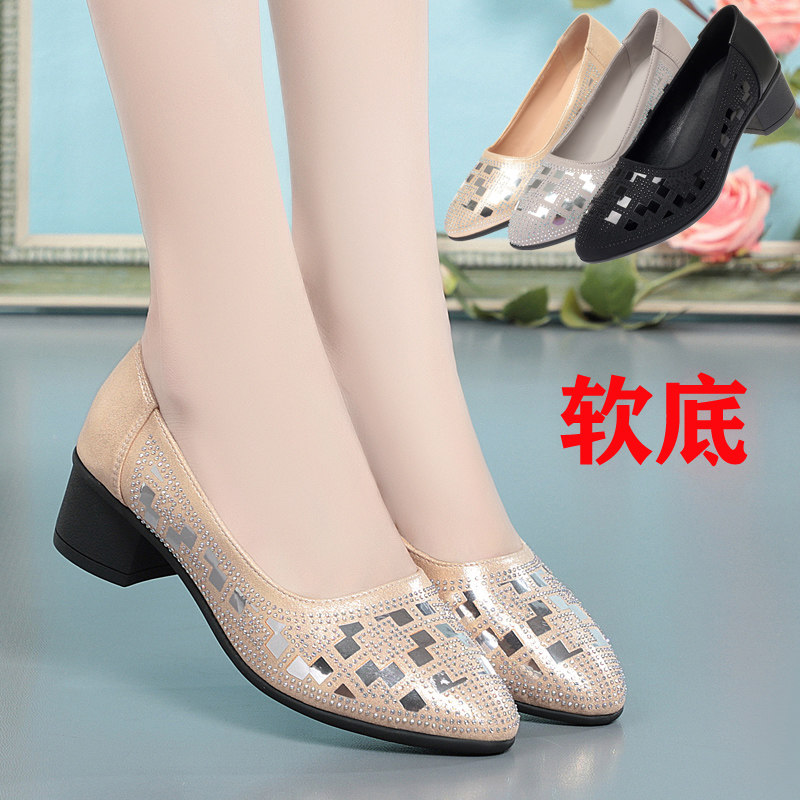 粗跟套脚女浅口单鞋烫钻大码女鞋中年妈妈鞋软底中跟优雅广场舞鞋