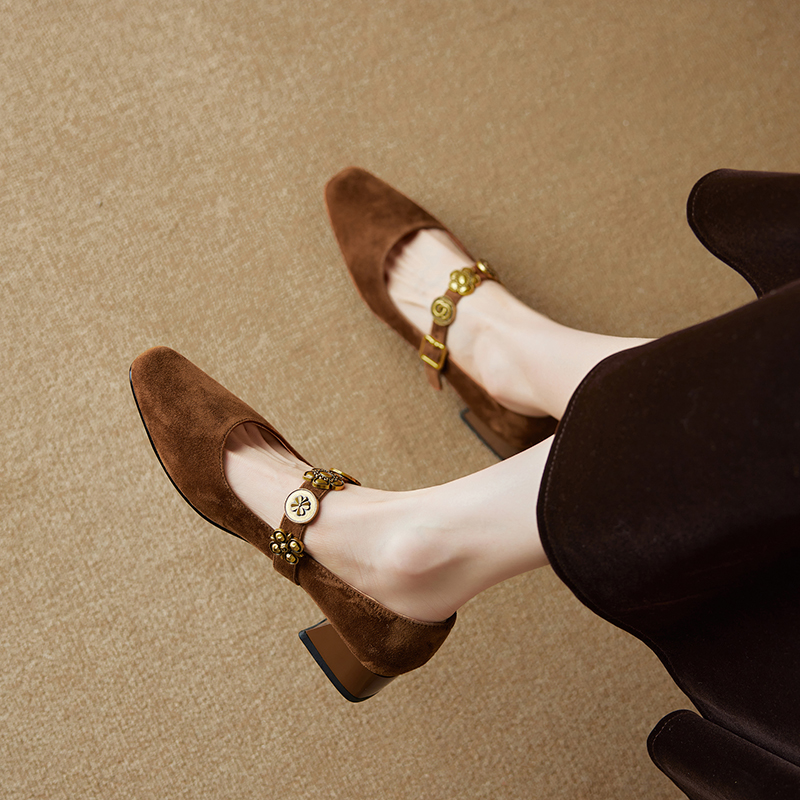 2025年新款法式方头低跟西施绒玛丽珍鞋子女一字扣带浅口粗跟单鞋