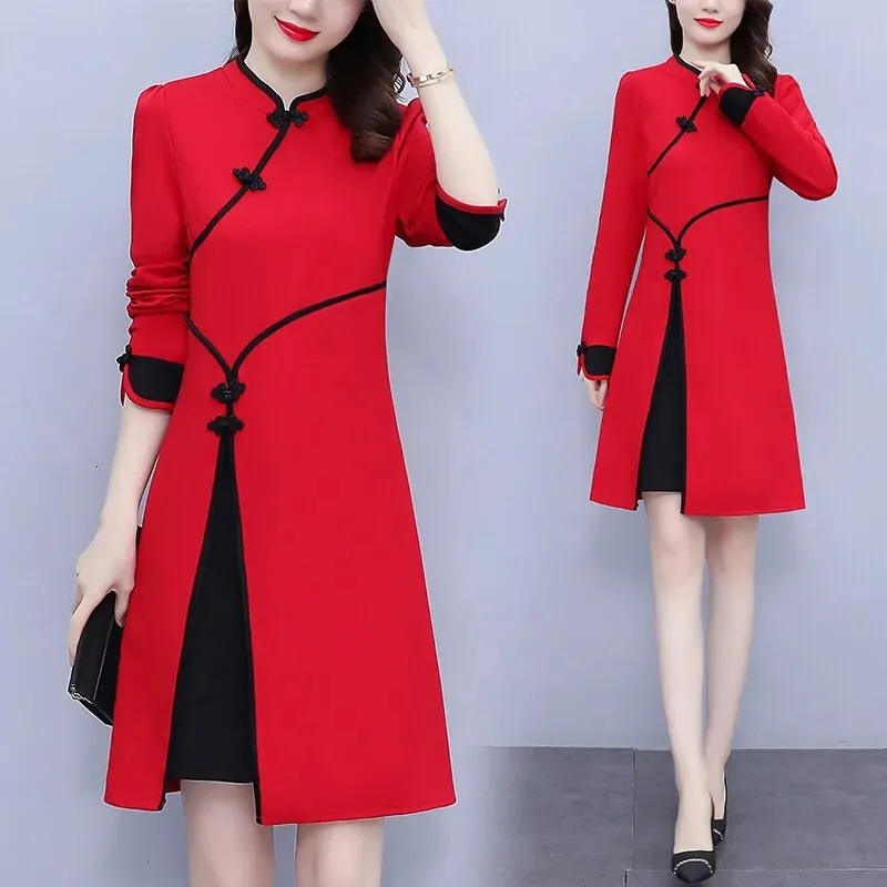 2023秋冬加绒高贵民族风网红改良款旗袍连衣裙女中长款打底裙气质