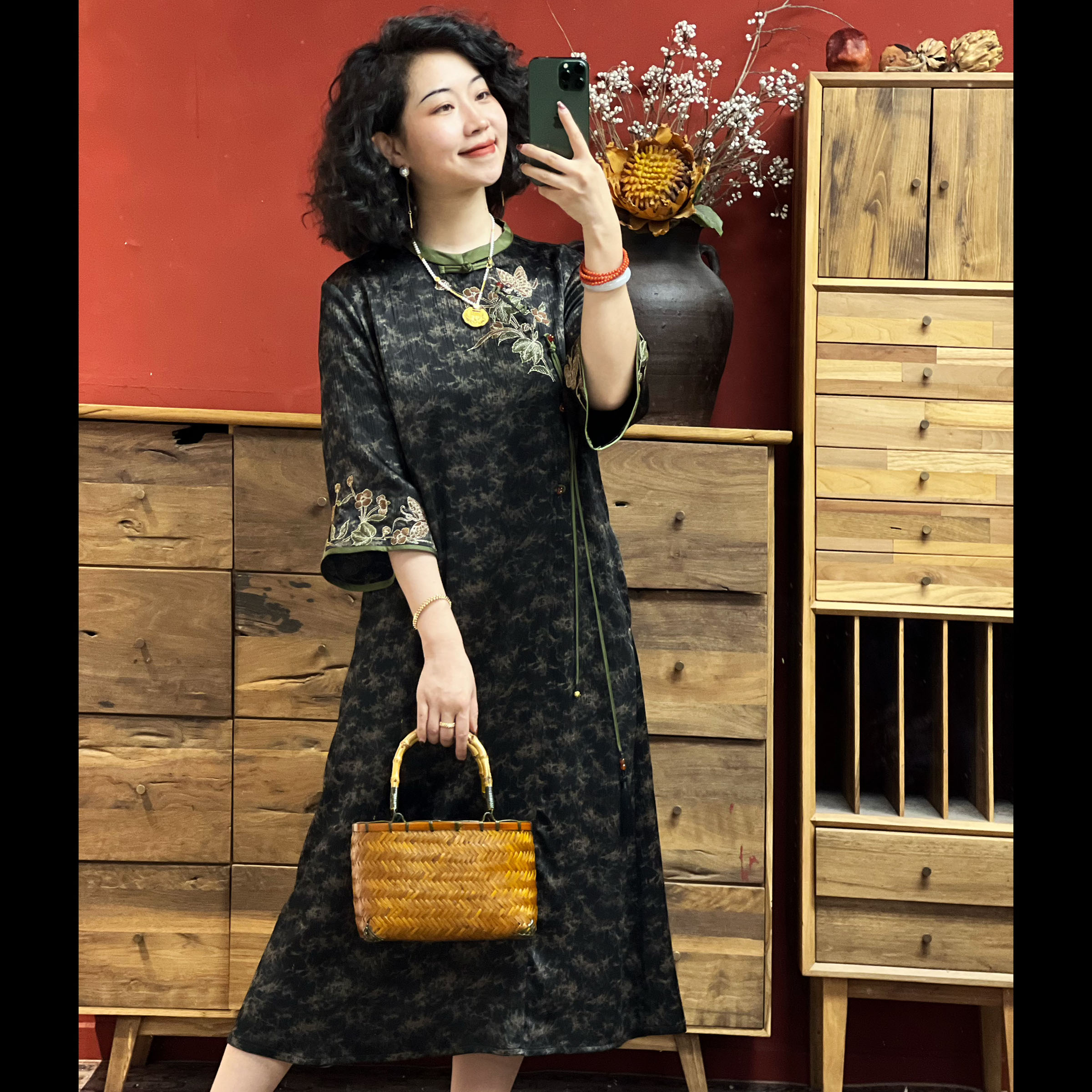 重磅真丝改良旗袍2025春秋新款桑蚕丝香云纱绢纺复古民族风连衣裙