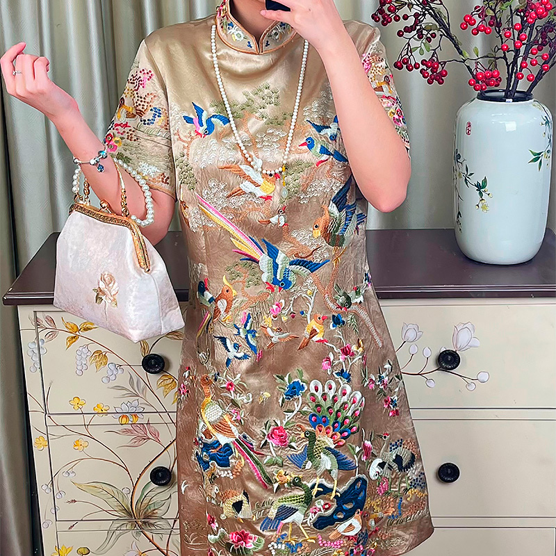 美伦民族风改良旗袍新中式2025重工凤凰刺绣复古气质修身连衣裙