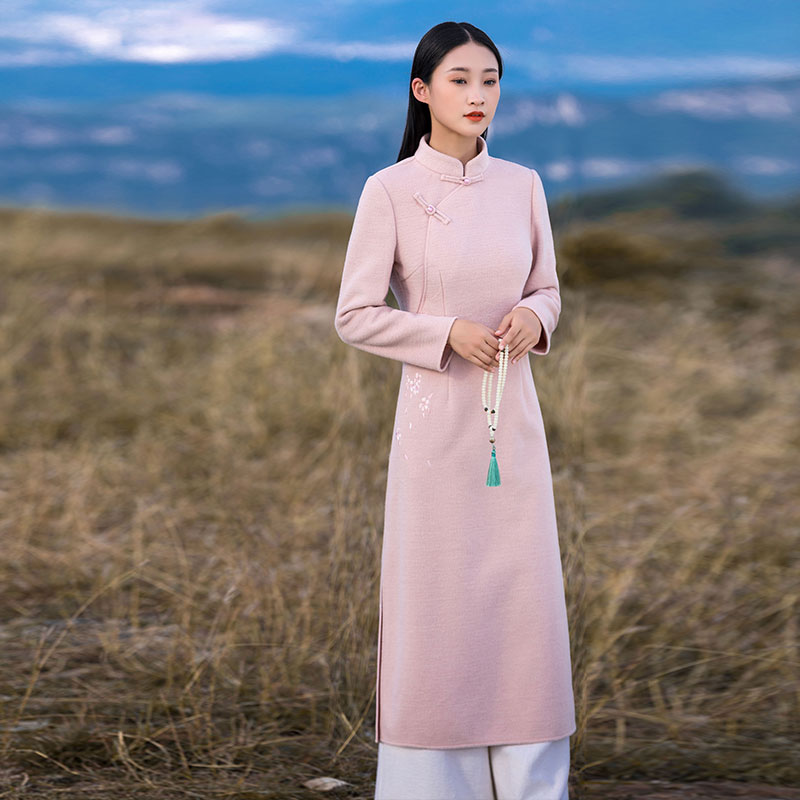 复古民族风棉麻加绒连衣裙冬季长款立领刺绣改良旗袍裙显瘦长裙子