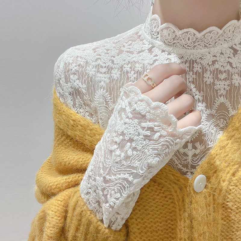 蕾丝打底衫女秋冬季白色宽松小衫毛衣内搭纱衣半高领长袖网纱上衣